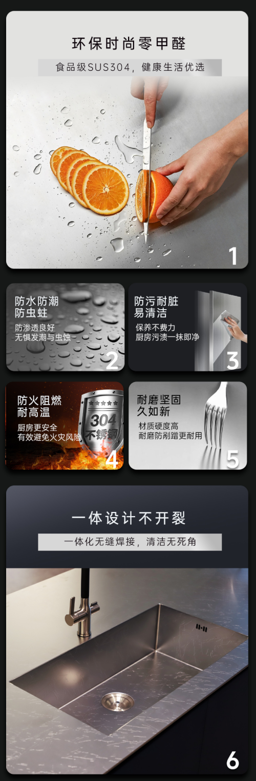 第三、烹洗更健康。消費者對于廚房的訴求,除了美觀和多功能性,還要有更大的便捷性,烹飪凈洗健康,下廚要成為一種享受。不銹鋼集成廚房產(chǎn)品不僅融合不銹鋼材質(zhì)賦予廚房出色的耐用性、易于清潔、安全、環(huán)保無甲醛等優(yōu)點,讓廚房的日常維護變得輕松簡單。